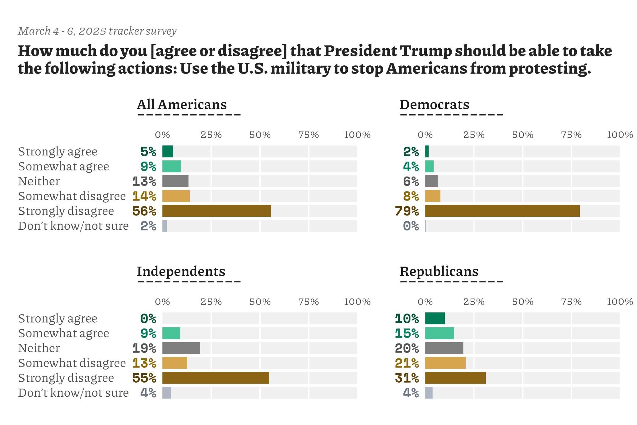 Opposition to misuse of the military is consistent across party lines: Majorities of Democrats, Republicans, and independents all disagree with it. Just 5% of Americans say they strongly agree the president should be able to use the military to stop protests.
