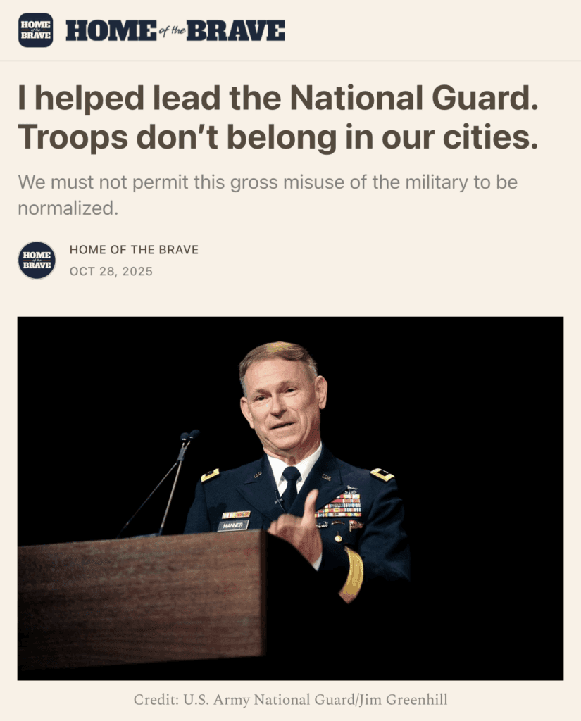 And in a newsletter for Home of the Brave, retired U.S. Army Maj. Gen Randy Manner writes that National Guard deployments in American cities are a misuse of troops, risks the politicization of the military, and endanger First Amendment rights.