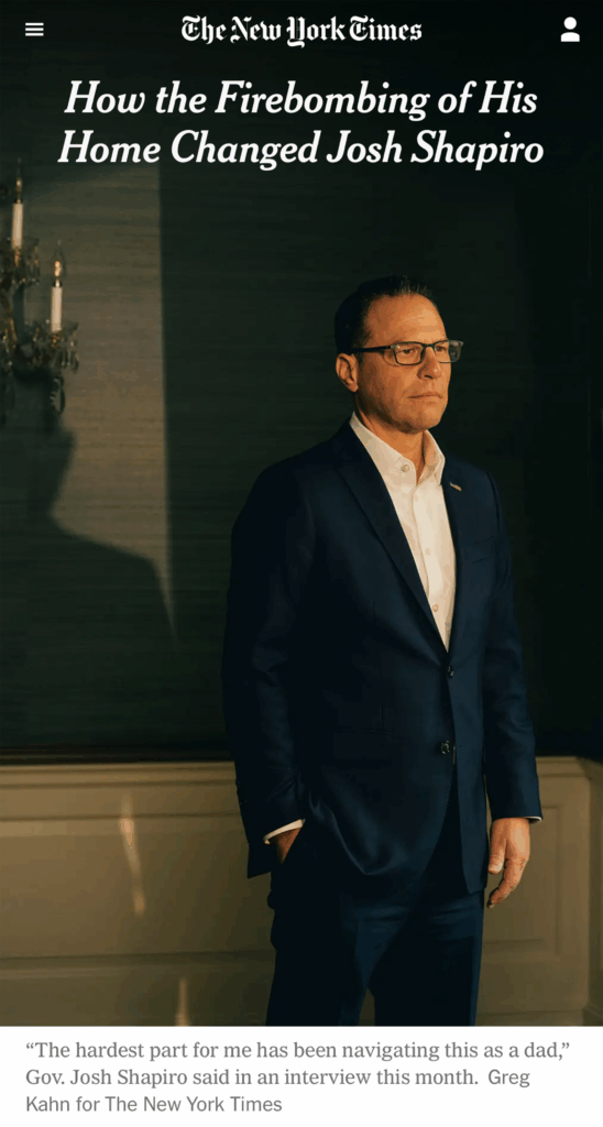 In an interview with The New York Times, Pennsylvania Gov. Josh Shapiro recounts how the arson attack on his home earlier this year motivated him to reach out to others impacted by political violence.