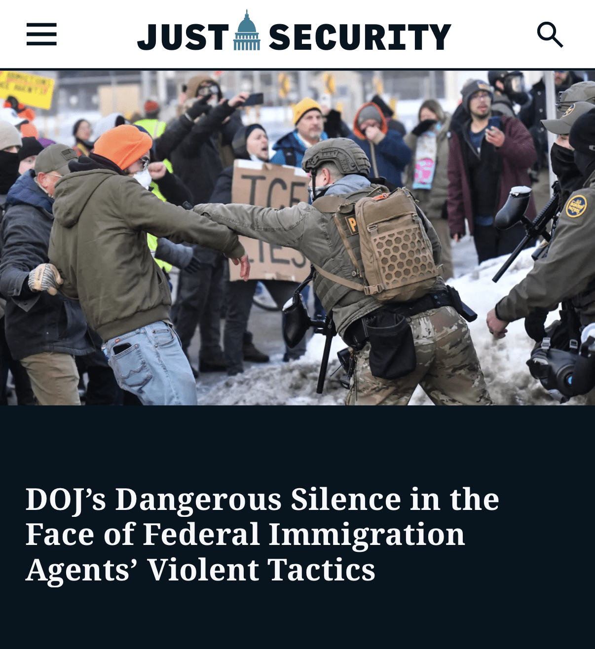 States United’s Samantha Trepel writes in Just Security that the tactics used by federal agents in immigration enforcement raise serious constitutional concerns, and that the Justice Department should hold agents accountable for any violations.