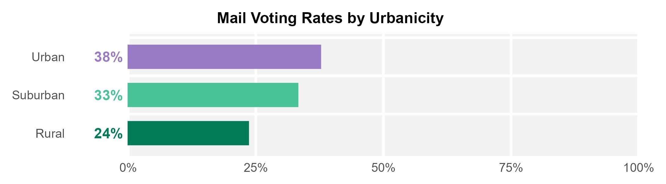 - Urbanicity: Voters in every geographic setting used mail ballots at high rates. Mailed ballots were cast by 1 in 3 suburban voters, 1 in 3 city voters, and 1 in 4 rural voters.