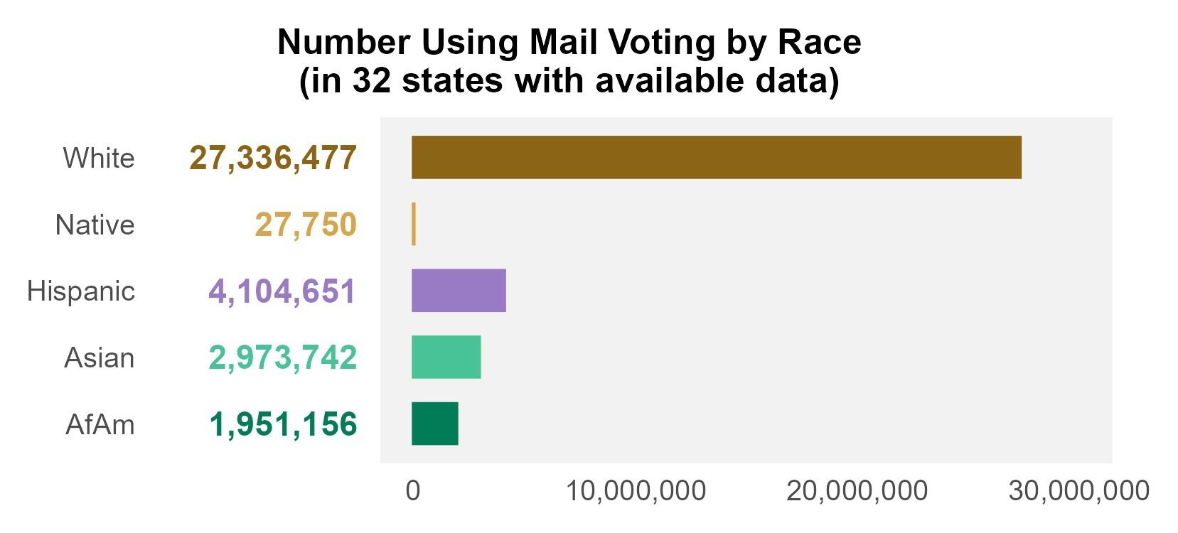 White voters were the largest group of voters to cast votes by mail in 2024. About 1 in 3 white voters voted by mail, accounting for over 27 million votes in the states analyzed.