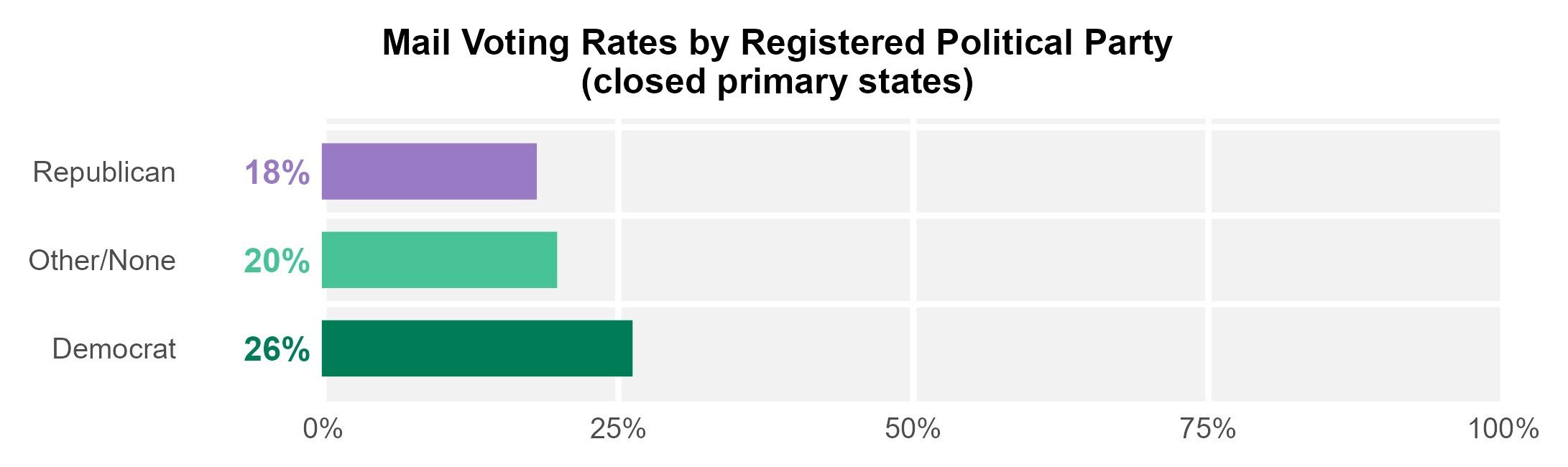 The analysis confirmed that mail voting was popular among voters across all parties in 2024. It shows that when we include states without closed primaries in the analysis, we see even higher rates of mail voting.