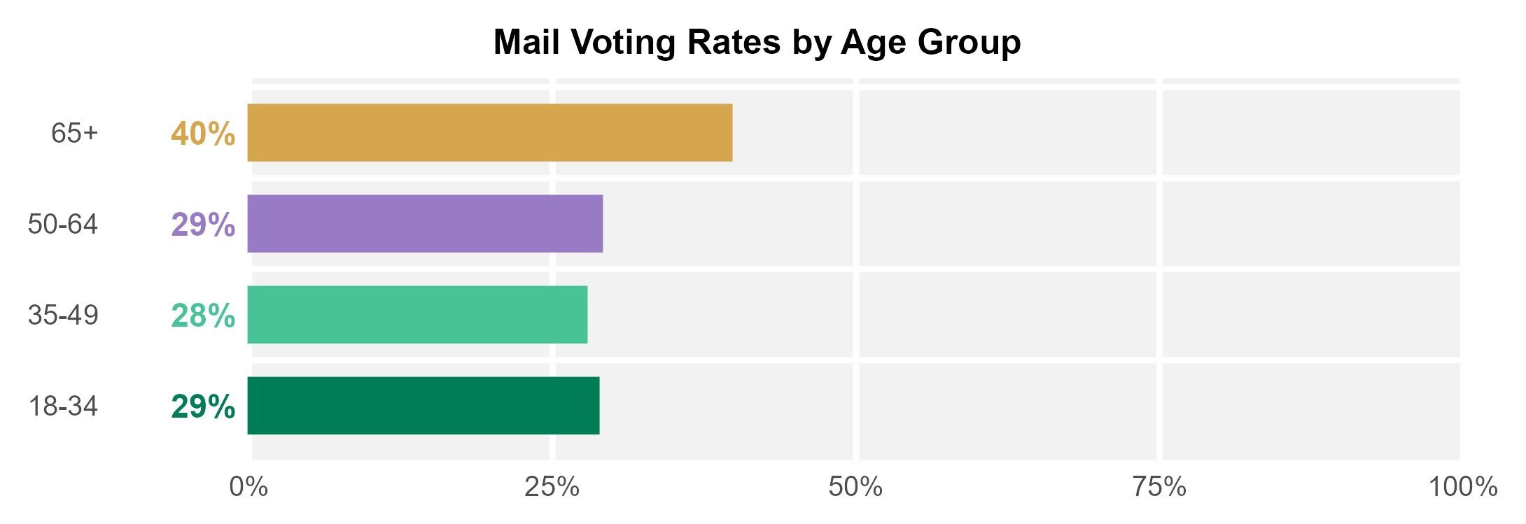 - Age: Voters ages 65+ were most likely to use mail voting. Mailed ballots accounted for almost 40% of votes cast by this group.