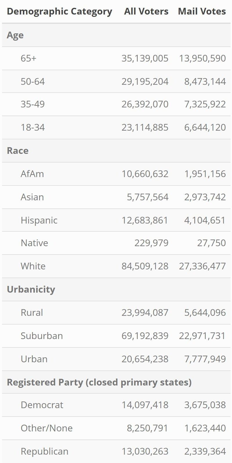 The table below provides the raw numbers on which the demographic charts are based: total numbers of those who voted from each demographic group and the numbers who voted by mail.