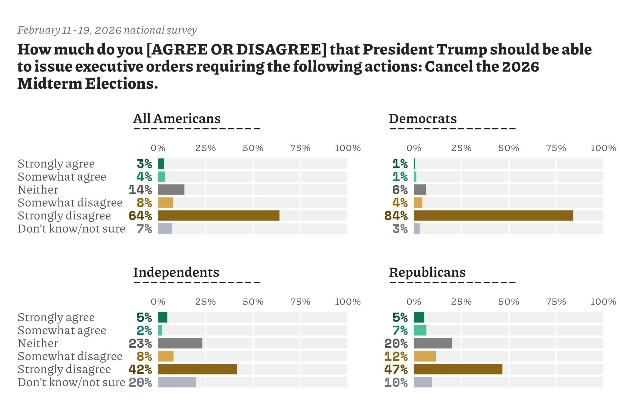 Americans overwhelmingly oppose the idea of President Trump canceling the midterms by issuing an executive order. Majorities of Republicans, Democrats, and independents say President Trump should not be allowed to do this. There is no constituency for canceling the midterms.