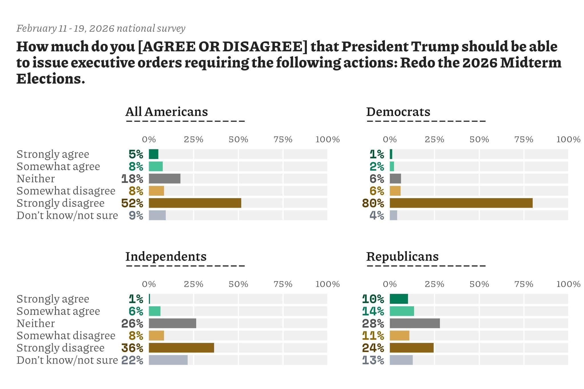 Americans are also strongly opposed to Trump issuing an executive order to redo the 2026 midterms. About 60% disagree that Trump should be able to redo the election, compared to just 13% who agree. With a net agreement of –47, there is no constituency for redoing the midterms.