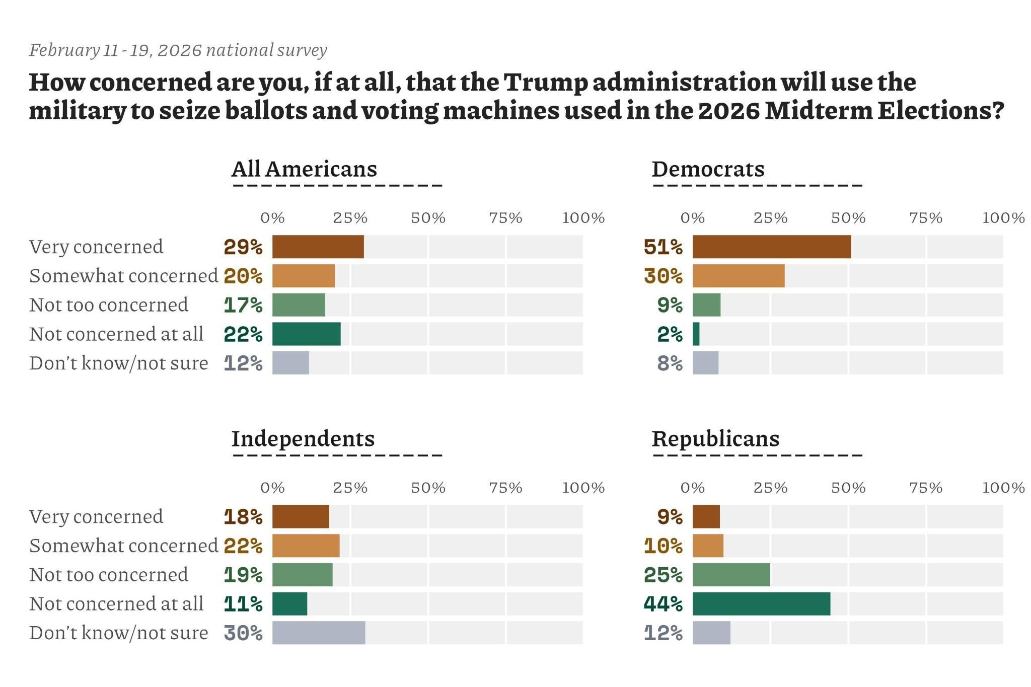 Just shy of half of Americans (49%) express concern that the Trump administration will use the military to seize ballots and voting machines used in the 2026 midterms. A smaller share (39%) say they are not too concerned or not concerned at all about this possibility. Democrats express notably higher levels of concern (81%) than independents (40%) and Republicans (19%). Overall, the net 10 percentage point gap shows that many Americans are concerned about military seizure of ballots and voting machines during the 2026 midterms.