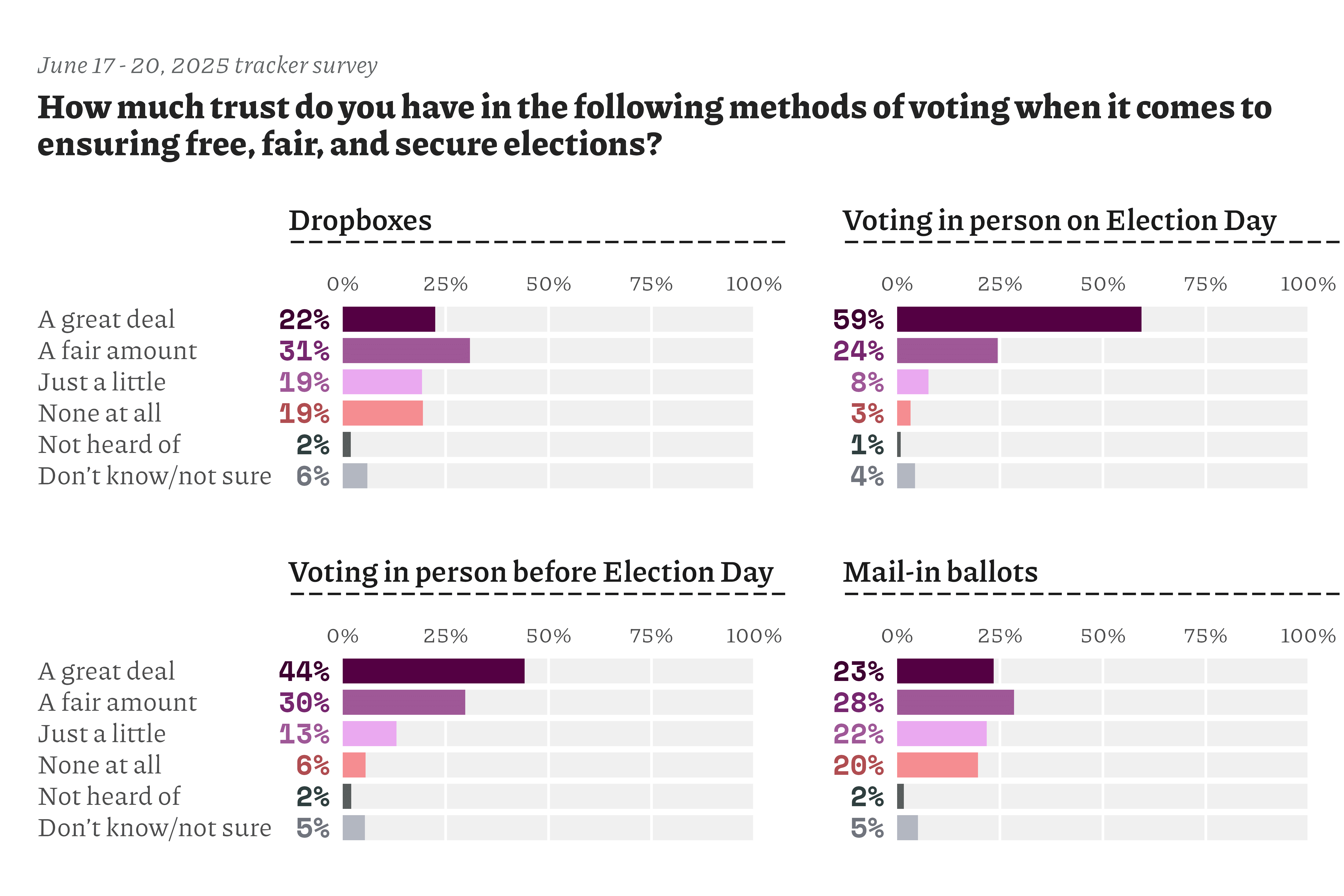 - Consistent with surveys over time, polling shows most Americans express either a great deal or a fair amount of trust in each casting a ballot by mail.