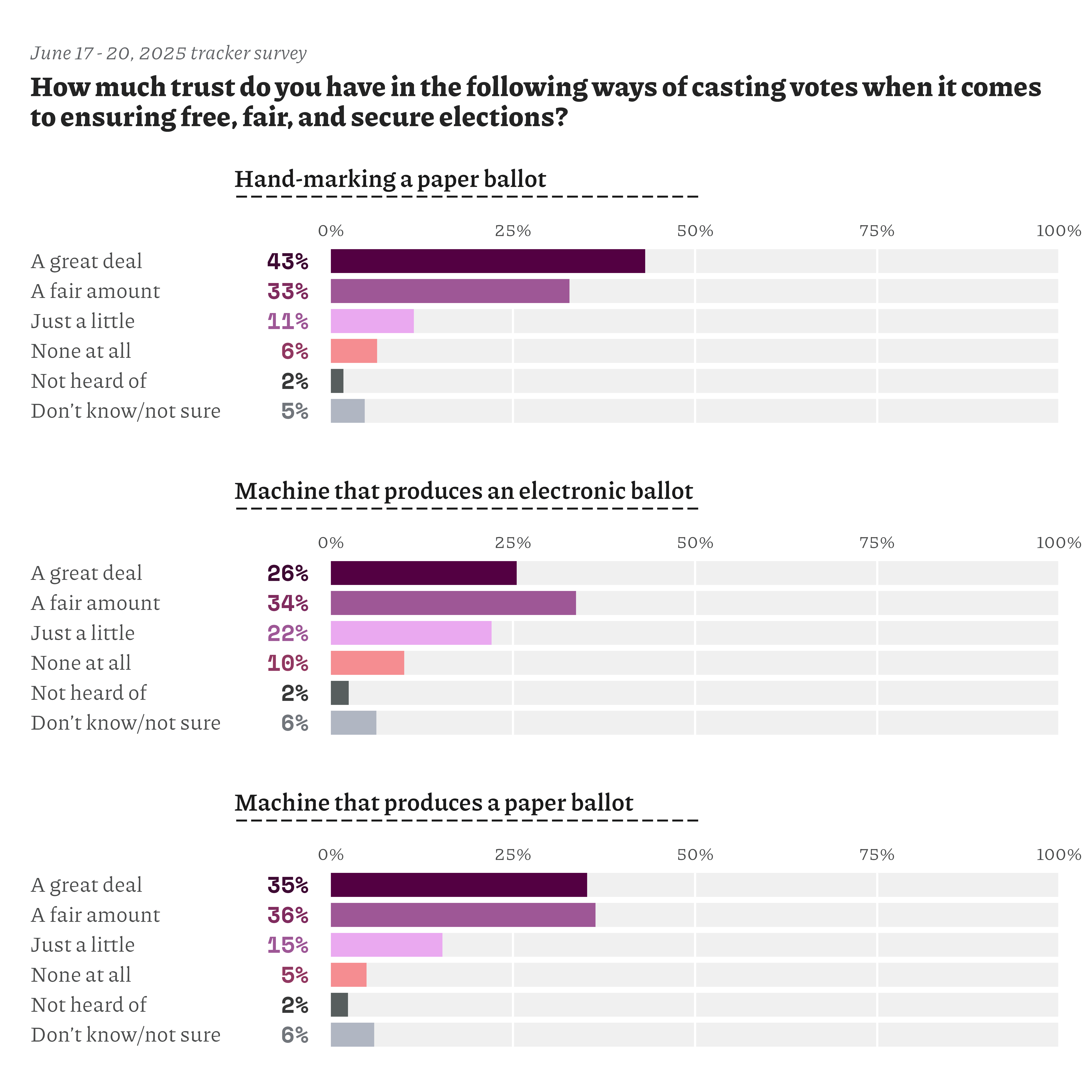 Americans were also asked about their levels of trust in different ways of casting votes. Every way—hand-marking a paper ballot, using a machine that produces an electronic ballot, and using a machine that produces a paper ballot—was trusted either a great deal or a fair amount by a majority of respondents. Hand-marking a paper ballot received the highest marks, with 43% of respondents saying they trusted it a great deal.