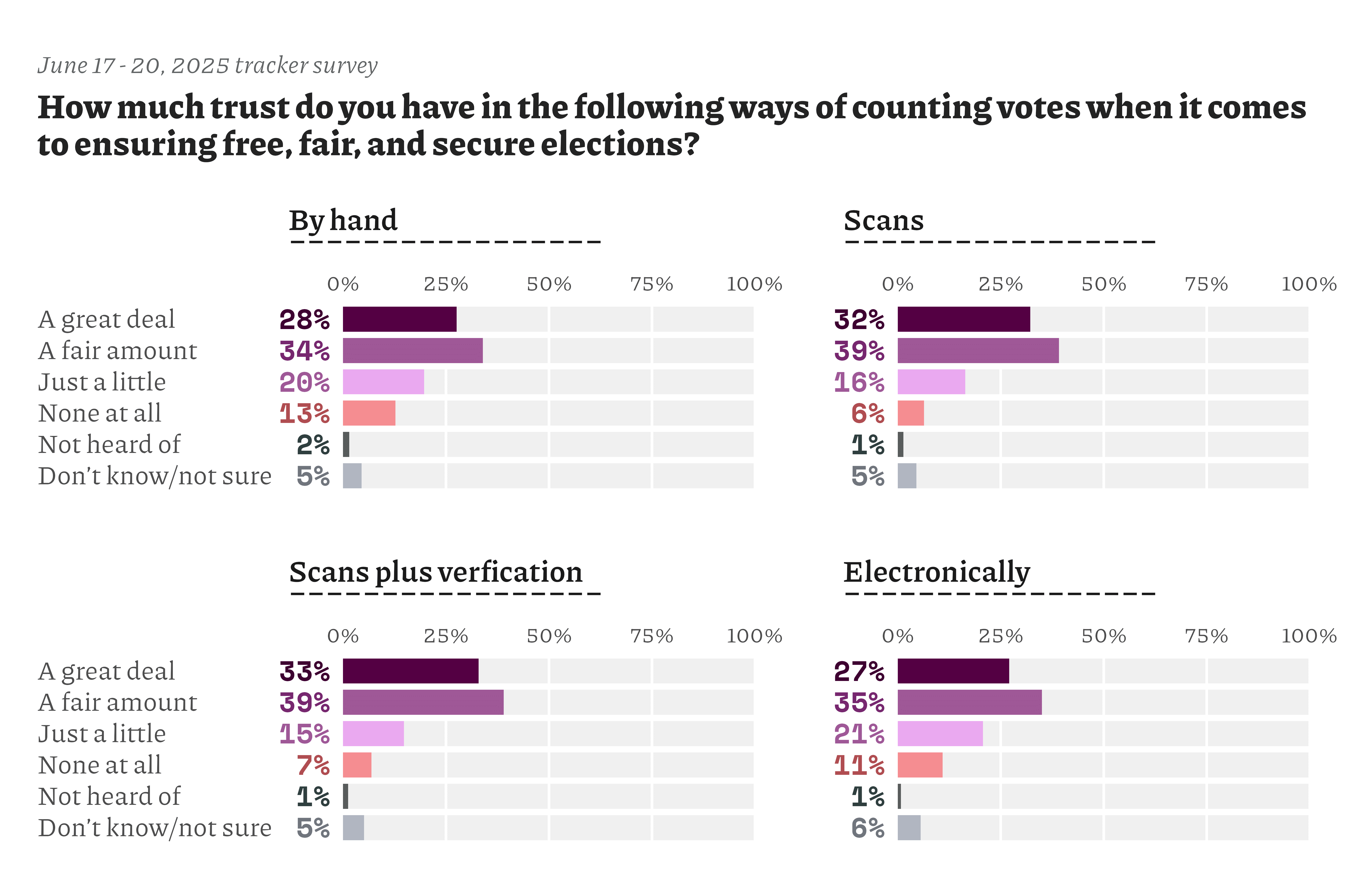 - States United polling shows Americans report high levels of trust in different methods of counting votes, including through scans, scans with additional verification, and electronically. The idea that Americans want to change these methods is not backed up by data.