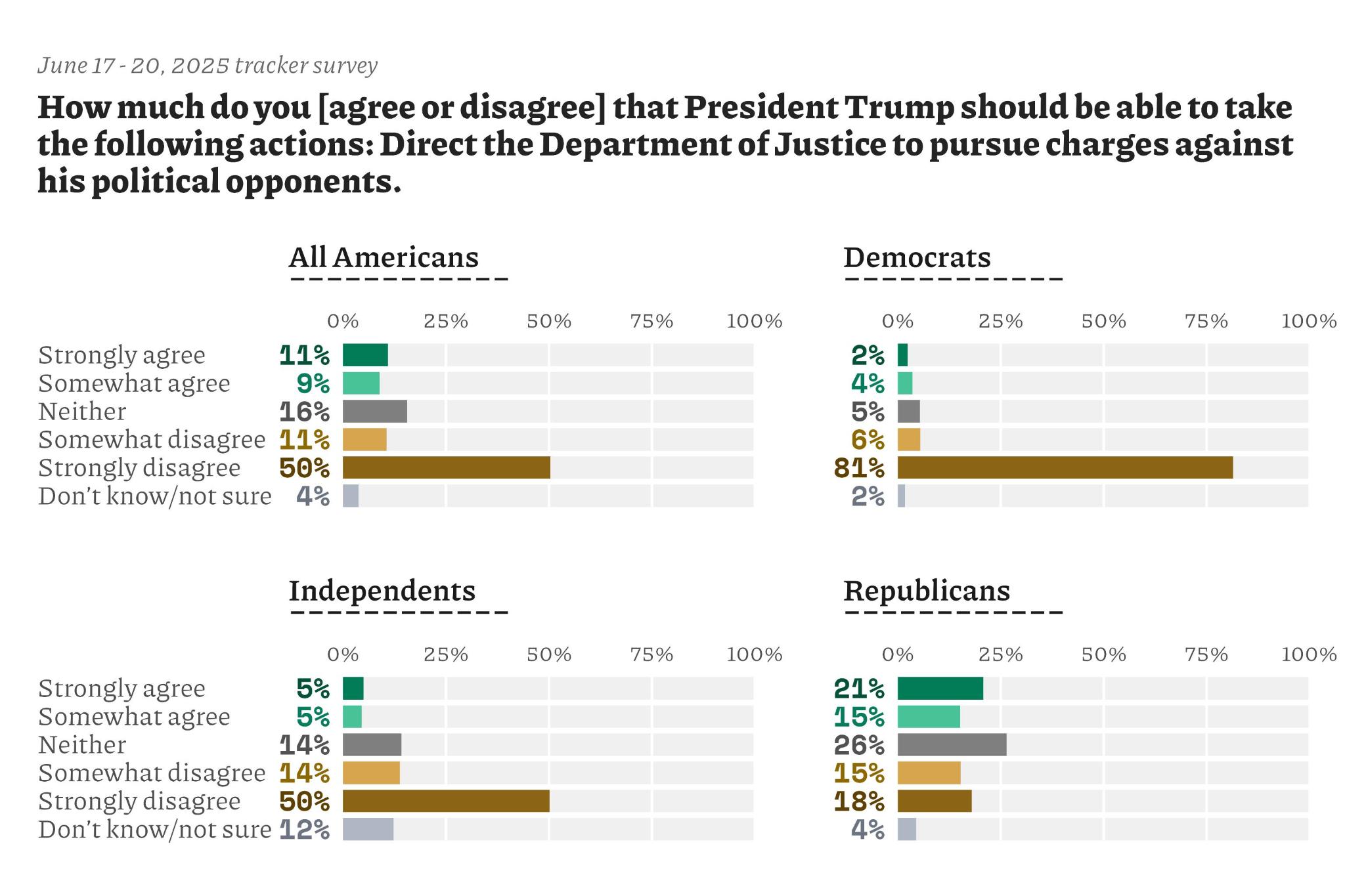 - Only 1 in 5 Americans agree that Trump should be able to use the Justice Department in this way, with the idea failing to earn majority support among Democrats, independents, and Republicans.