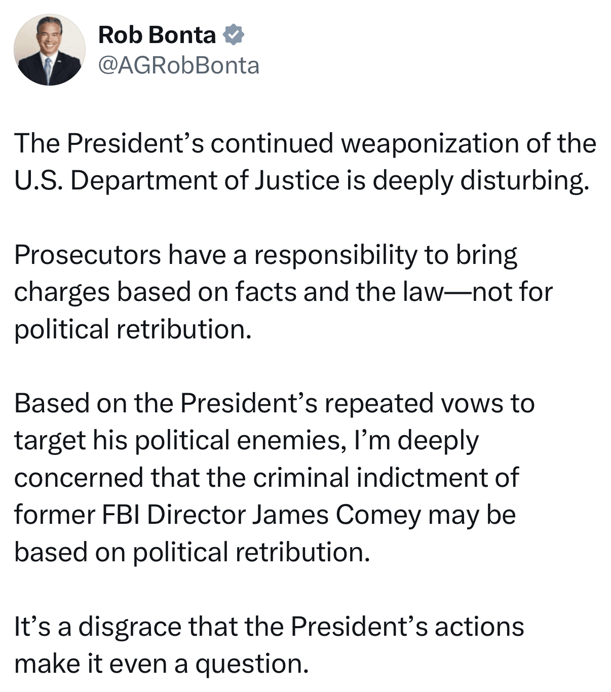 California Attorney General Rob Bonta similarly excoriated the charges against Comey, calling it disturbing, shameful, and a disgrace.
