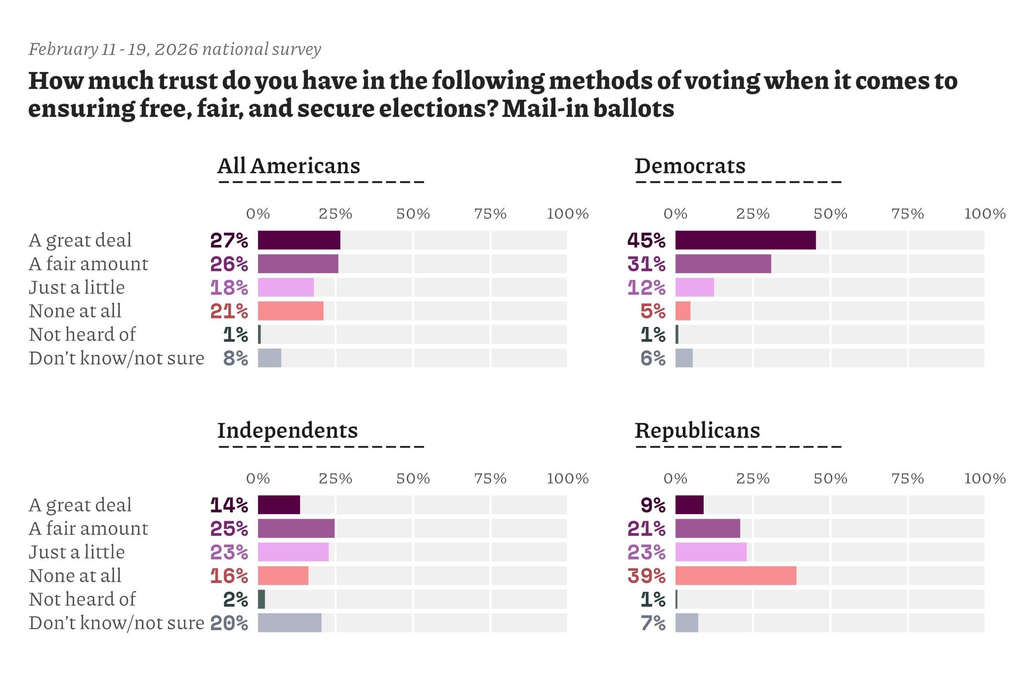 - More than 7 in 10 Americans have some level of trust for voting by mail—more than half of those surveyed have higher levels of trust.