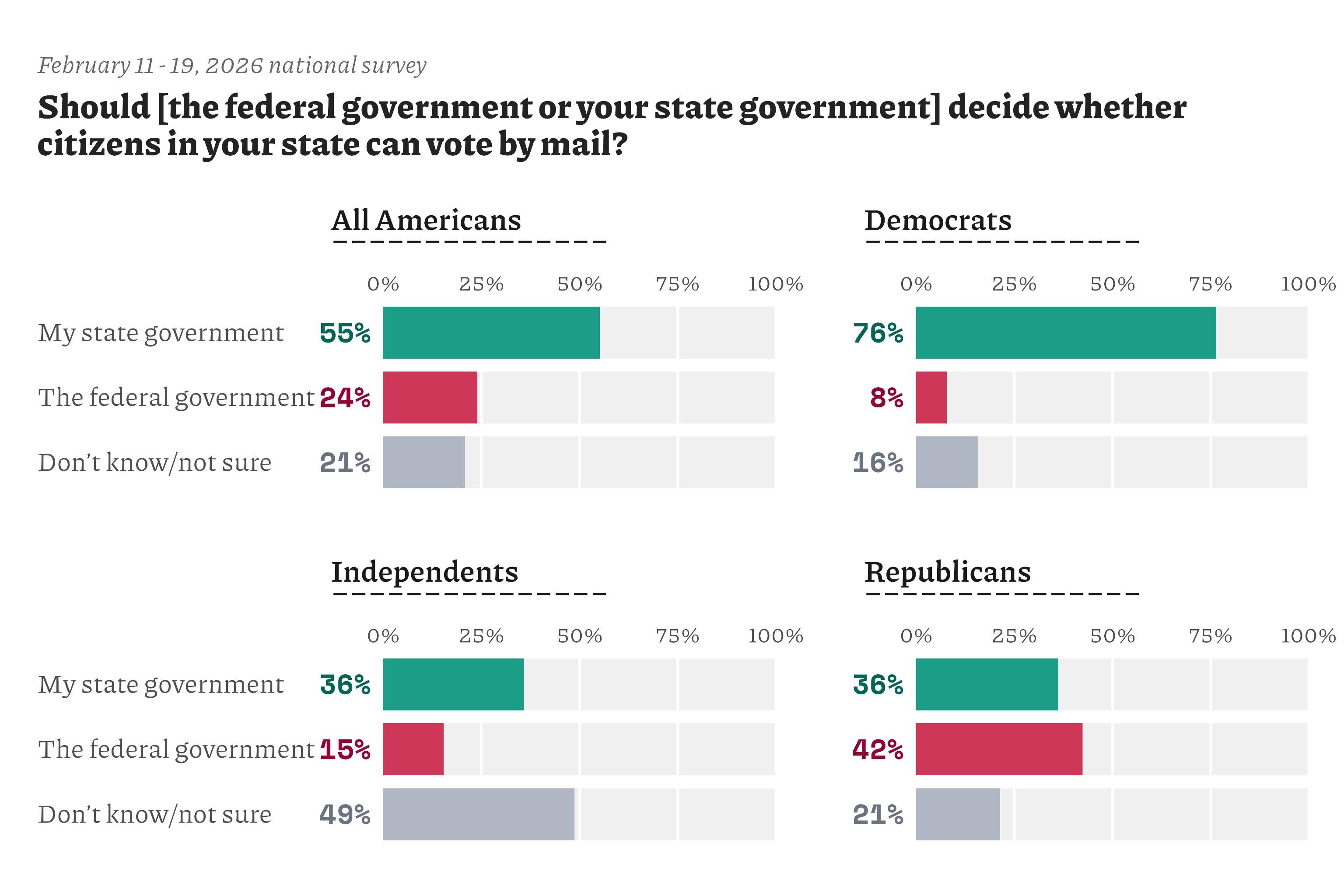 States United polling shows that a majority of Americans (53%) trust mail-in ballots to ensure free, fair, and secure elections. In addition, most Americans (55%) say their state government should decide whether citizens in their state should be able to vote by mail; Only 24% say the federal government should decide this. In the 2024 election, more than 48 million Americans voted by mail.