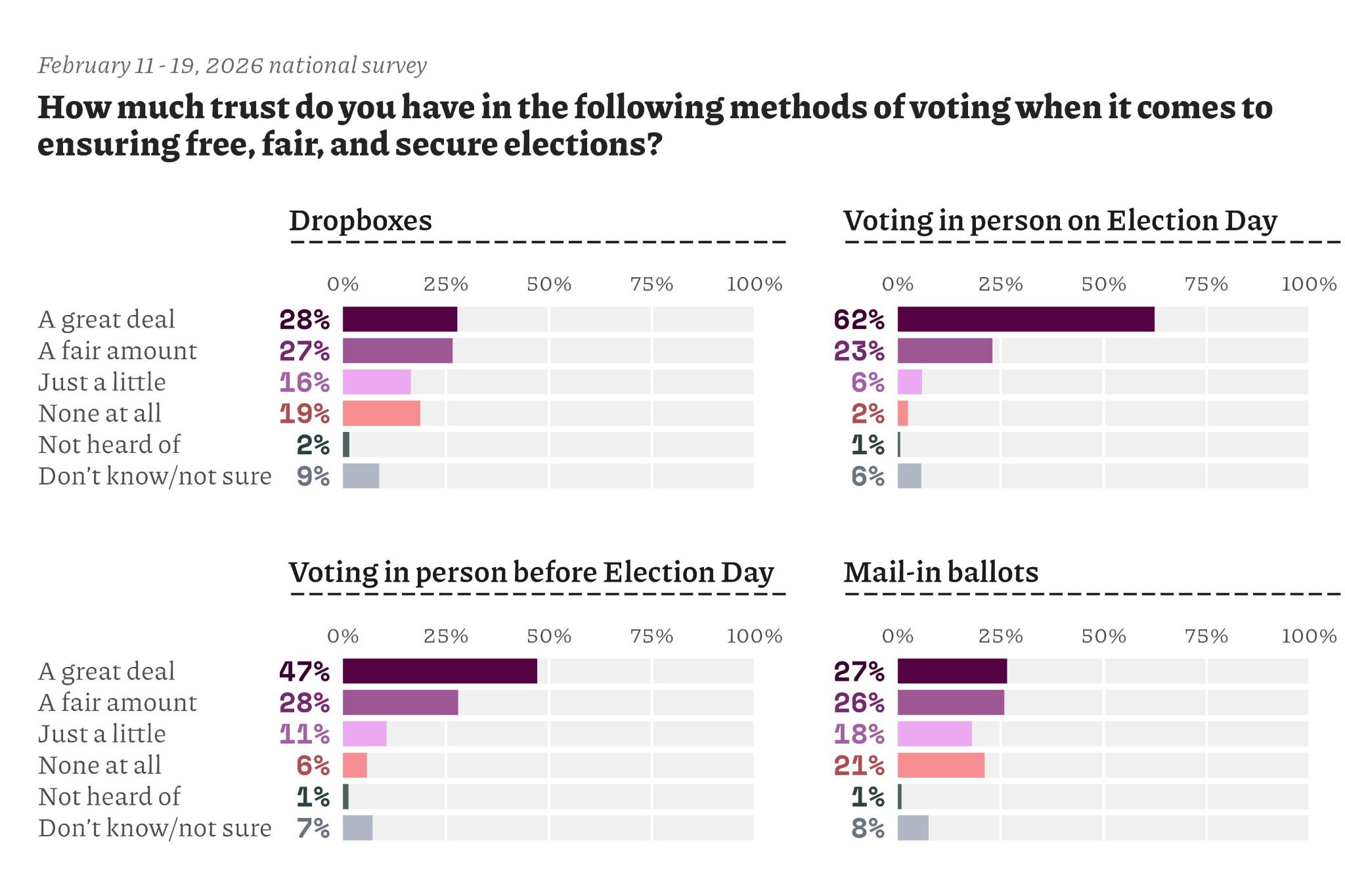 - Consistent with surveys over time, polling shows most Americans express either a great deal or a fair amount of trust in casting a ballot by mail.