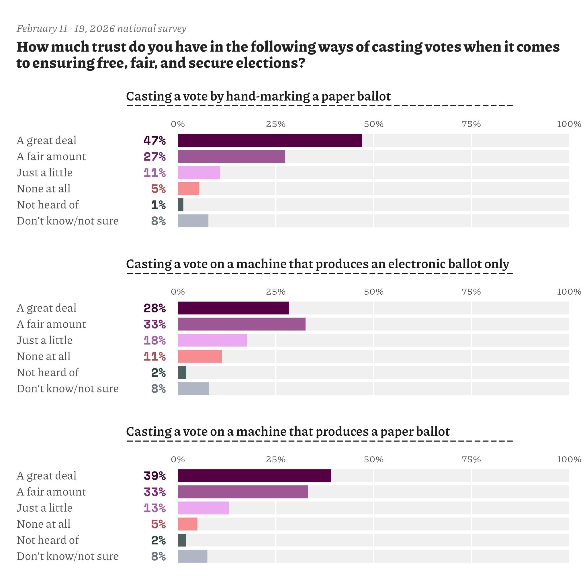 Americans were also asked about their levels of trust in different ways of casting votes. Every way—hand-marking a paper ballot, using a machine that produces an electronic ballot, and using a machine that produces a paper ballot—was trusted either a great deal or a fair amount by a majority of respondents. Hand-marking a paper ballot received the highest marks, with 47% of respondents saying they trusted it a great deal.