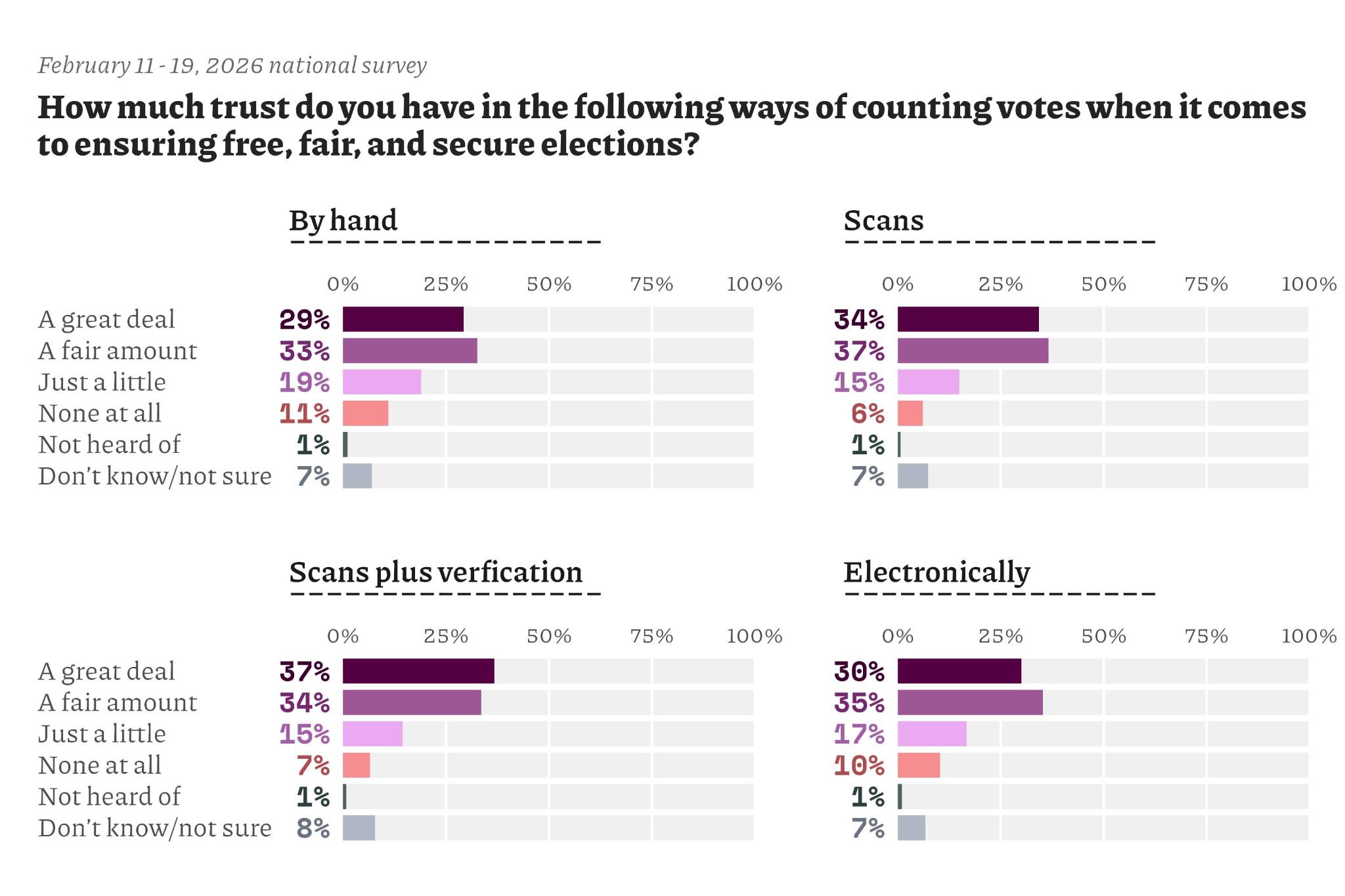 States United also asked Americans how much they trust different ways of counting votes. Those included counting votes entirely by hand, using machines that scan paper ballots, using machines that scan paper ballots that are later verified by a hand count, and completely electronically using machines. Again, large majorities of Americans expressed either a great or a fair amount of trust in each.