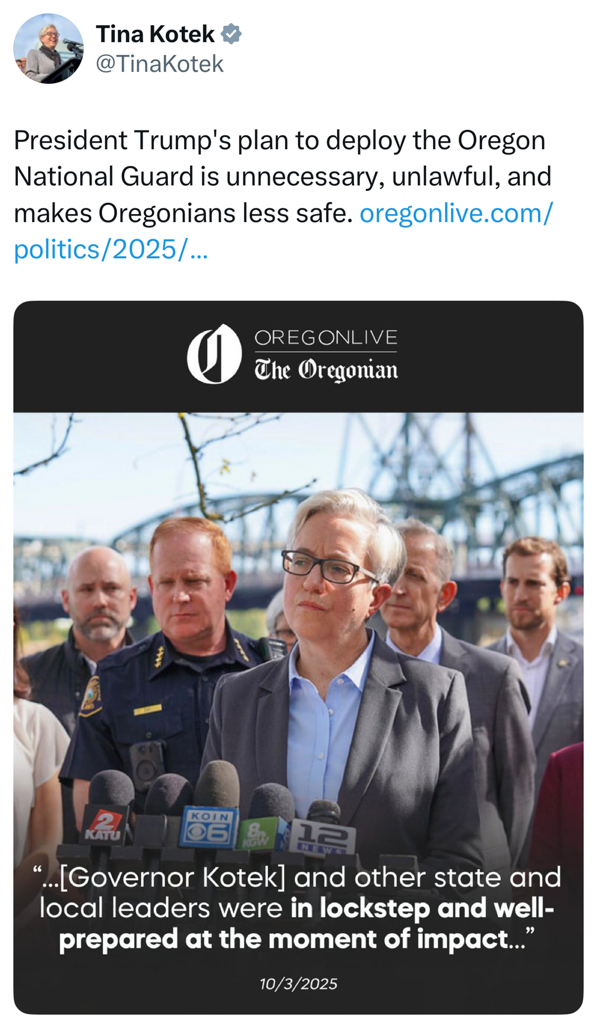 When President Trump called for deployments against the wishes of state and local leaders, without demonstrating any real need for such actions, Oregon Gov. Tina Kotek said Trump’s plan “is unnecessary, unlawful, and makes Oregonians less safe.” Illinois Gov. JB Pritzker said, “Donald Trump’s effort to deploy troops in American cities is not normal.” California Gov. Gavin Newsom called it a “brazen abuse of power.” Pennsylvania Gov. Josh Shapiro said, “They’ll have to go through me.” And Vermont Gov. Phil Scott said: “I don’t think our Guard should be used against our own people. I don’t think the military should be used against our own people. In fact, it’s unconstitutional.”